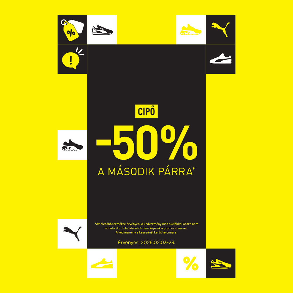 Vásárolj két pár cipőt és az olcsóbbikat fél áron kapod. A kedvezmény más akcióval nem vonható össze.